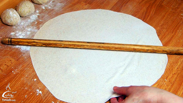 - روی سطح کار مقداری آرد پاشیده، خمیر را روی سطح کار قرار داده و با وردنه باریک خمیر را خیلی نازک پهن و باز کنید. خمیر یوفکای شما برای تهیه غذا آماده است.